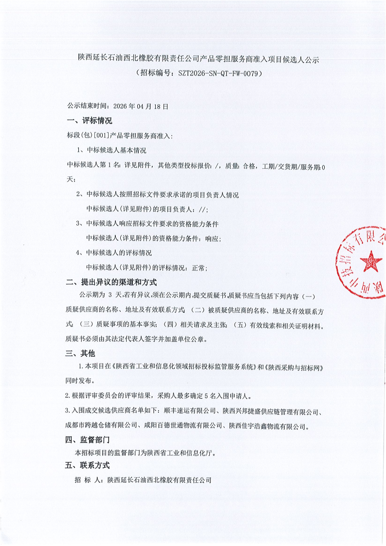 陕西延长石油西北橡胶有限责任公司产品零担服务商准入项目候选人公示