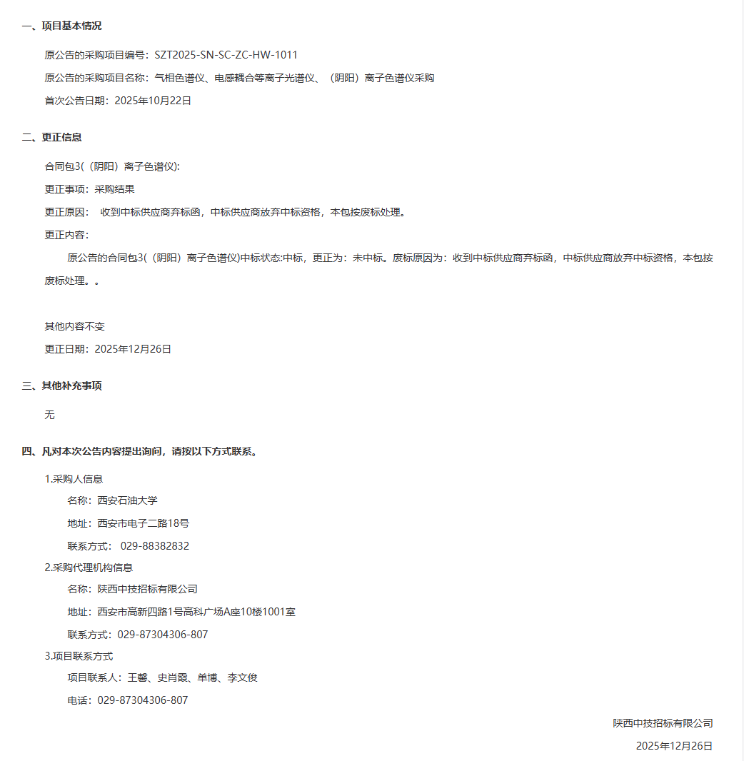 西安石油大学气相色谱仪、电感耦合等离子光谱仪、(阴阳)离子色谱仪采购结果更正公告(第一次)