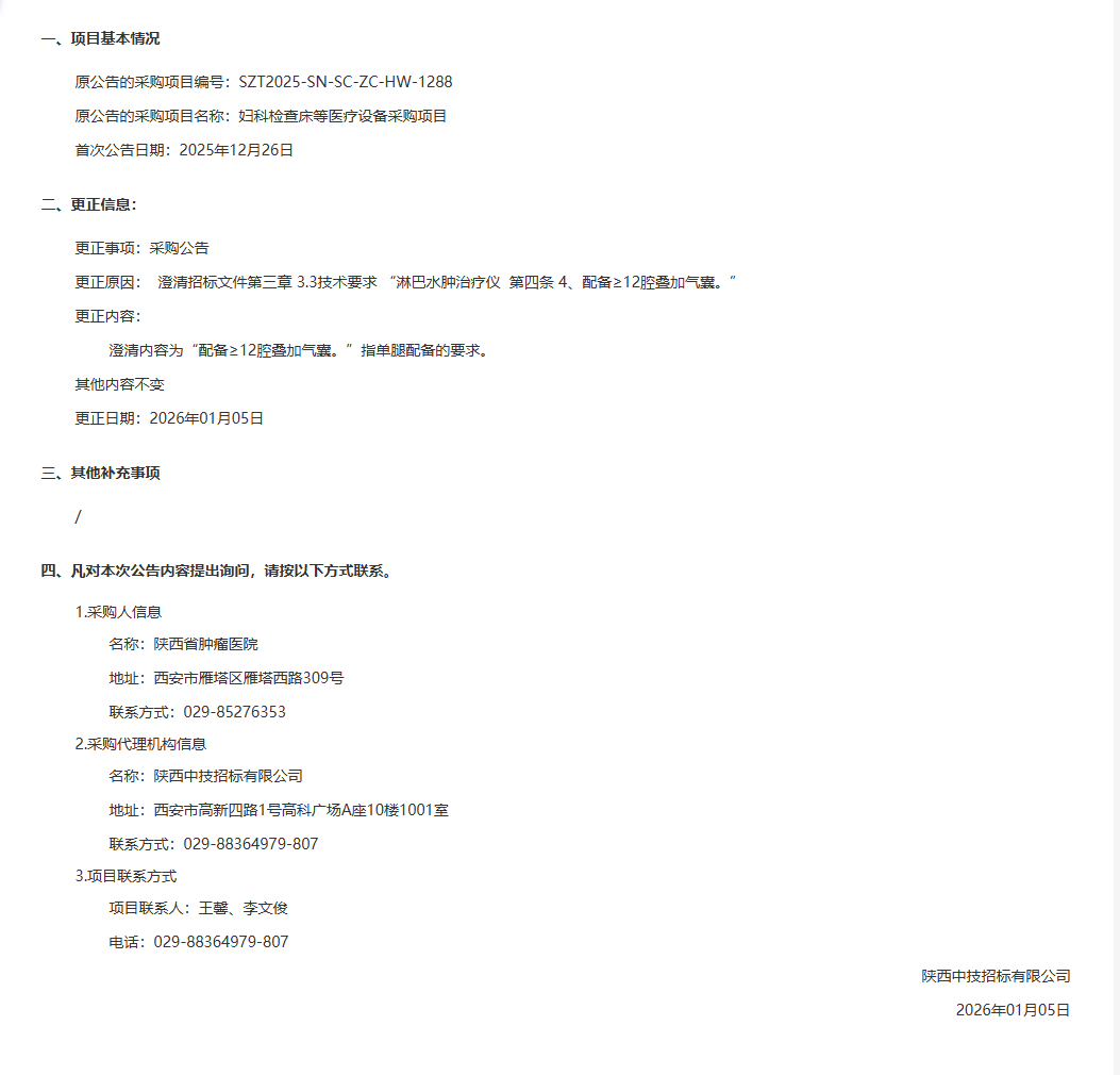 陕西省肿瘤医院妇科检查床等医疗设备采购项目澄清公告