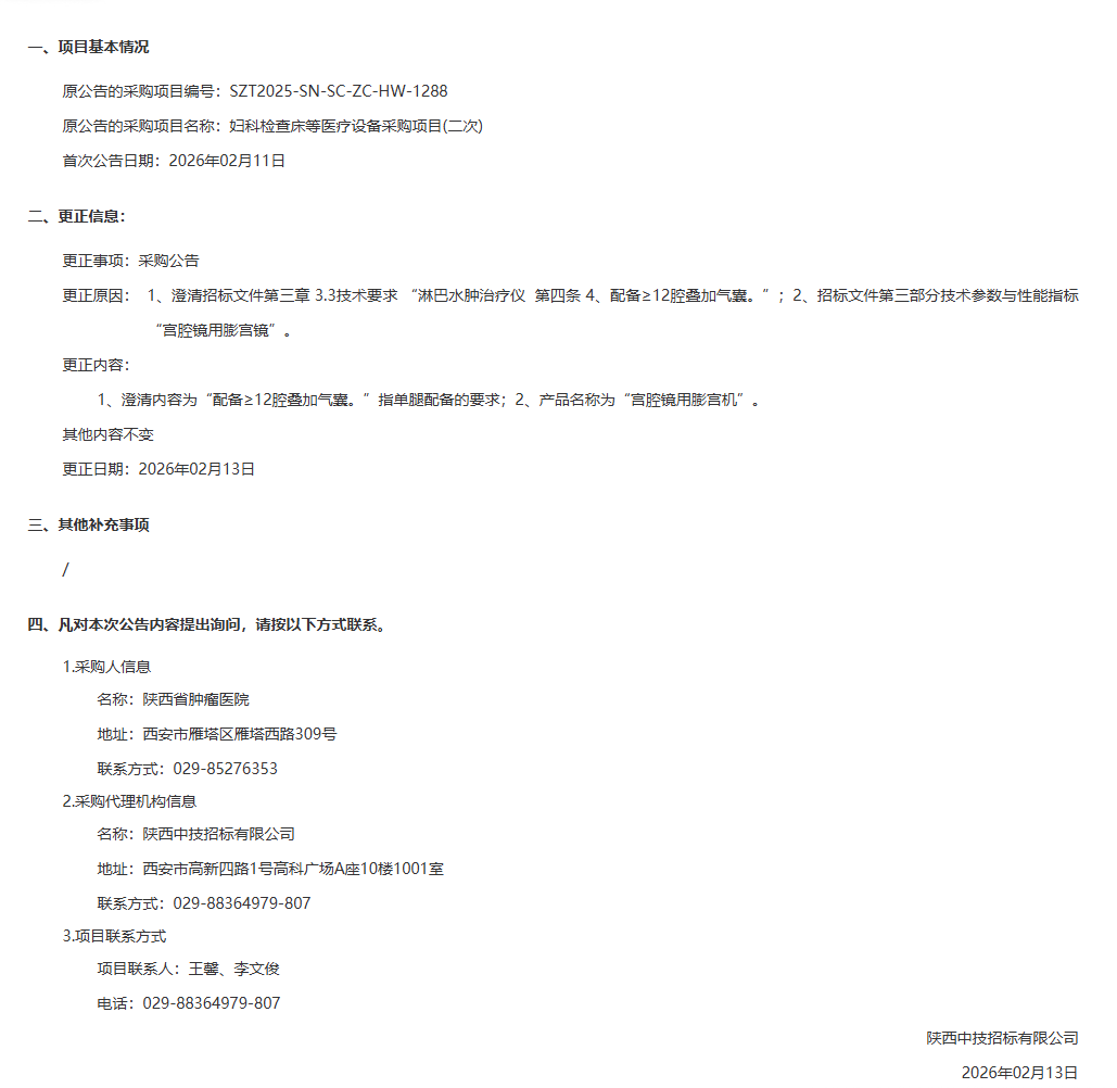 陕西省肿瘤医院妇科检查床等医疗设备采购项目(二次)澄清公告