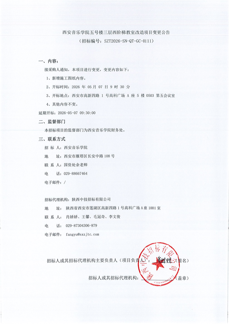 西安音乐学院五号楼三层西阶梯教室改造项目变更公告
