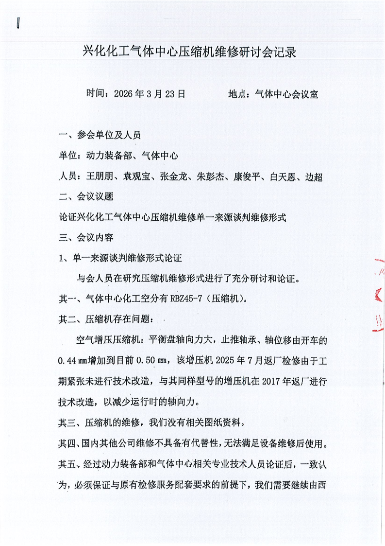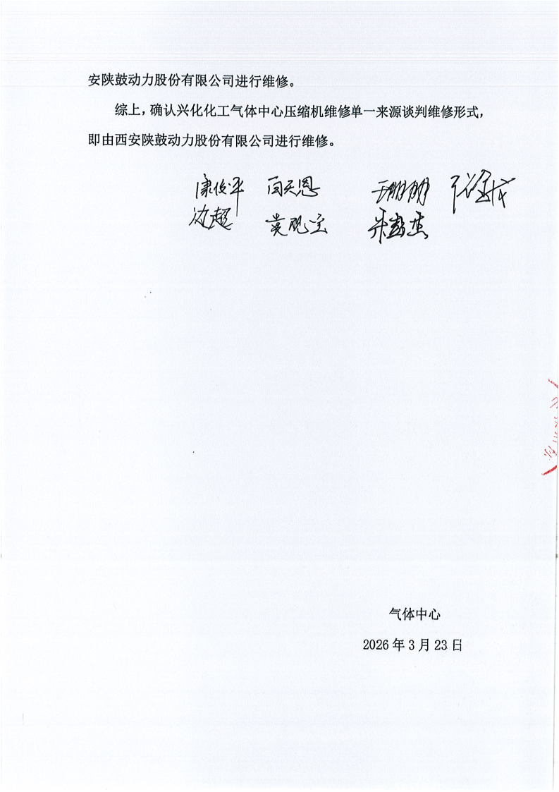 兴化化工-气体中心北套机组增压机维修项目实行单一来源采购方式的公示