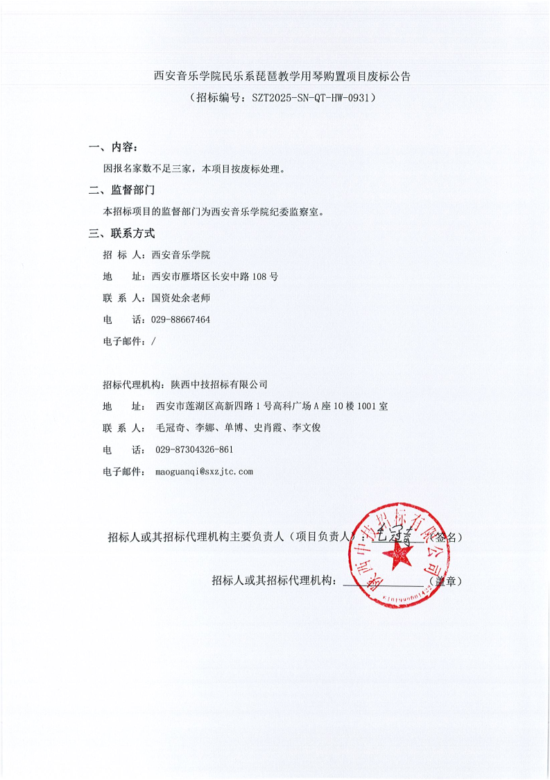 西安音乐学院民乐系琵琶教学用琴购置项目废标公告