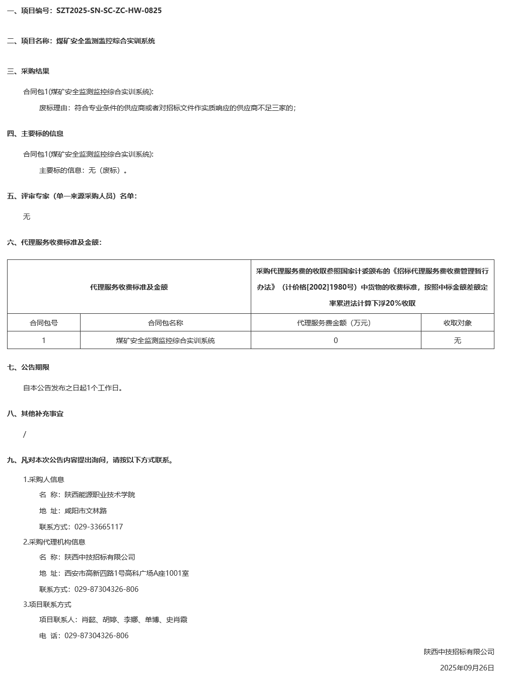陕西能源职业技术学院煤矿安全监测监控综合实训系统结果公告