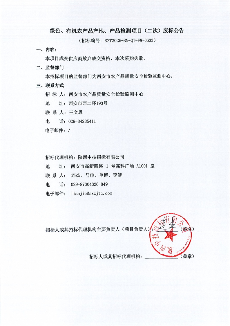 绿色、有机农产品产地、产品检测项目(二次)废标公告