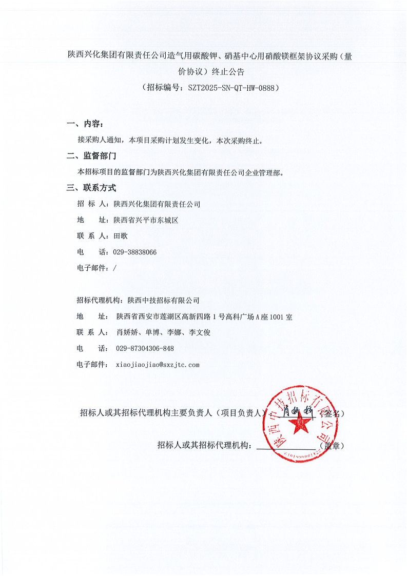 陕西兴化集团有限责任公司造气用碳酸钾、硝基中心用硝酸镁框架协议采购(量价协议)终止公告