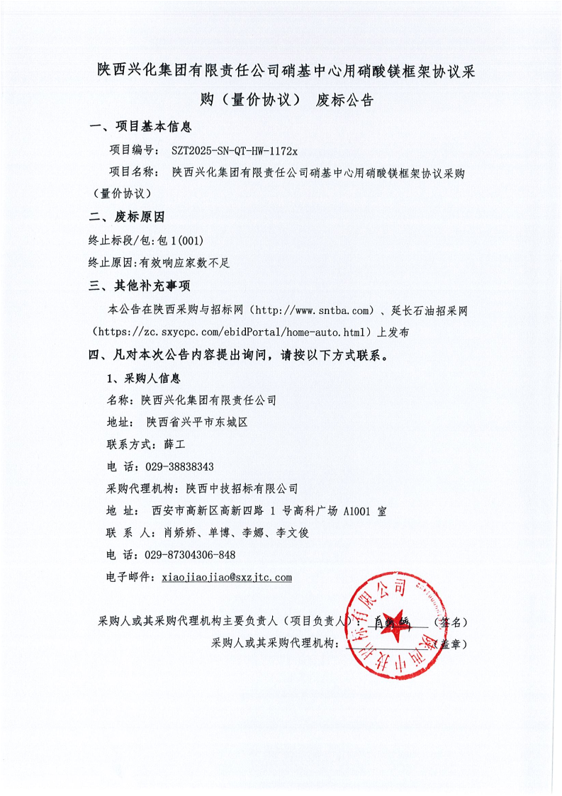 陕西兴化集团有限责任公司硝基中心用硝酸镁框架协议采购(量价协议)废标公告