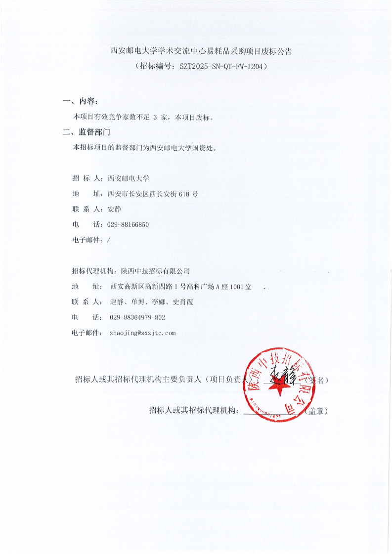 西安邮电大学学术交流中心易耗品采购项目废标公告