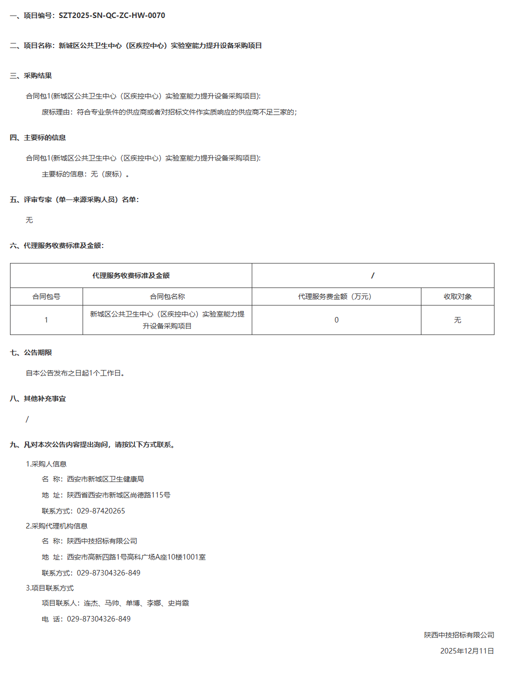 西安市新城区卫生健康局新城区公共卫生中心(区疾控中心)实验室能力提升设备采购项目结果公告