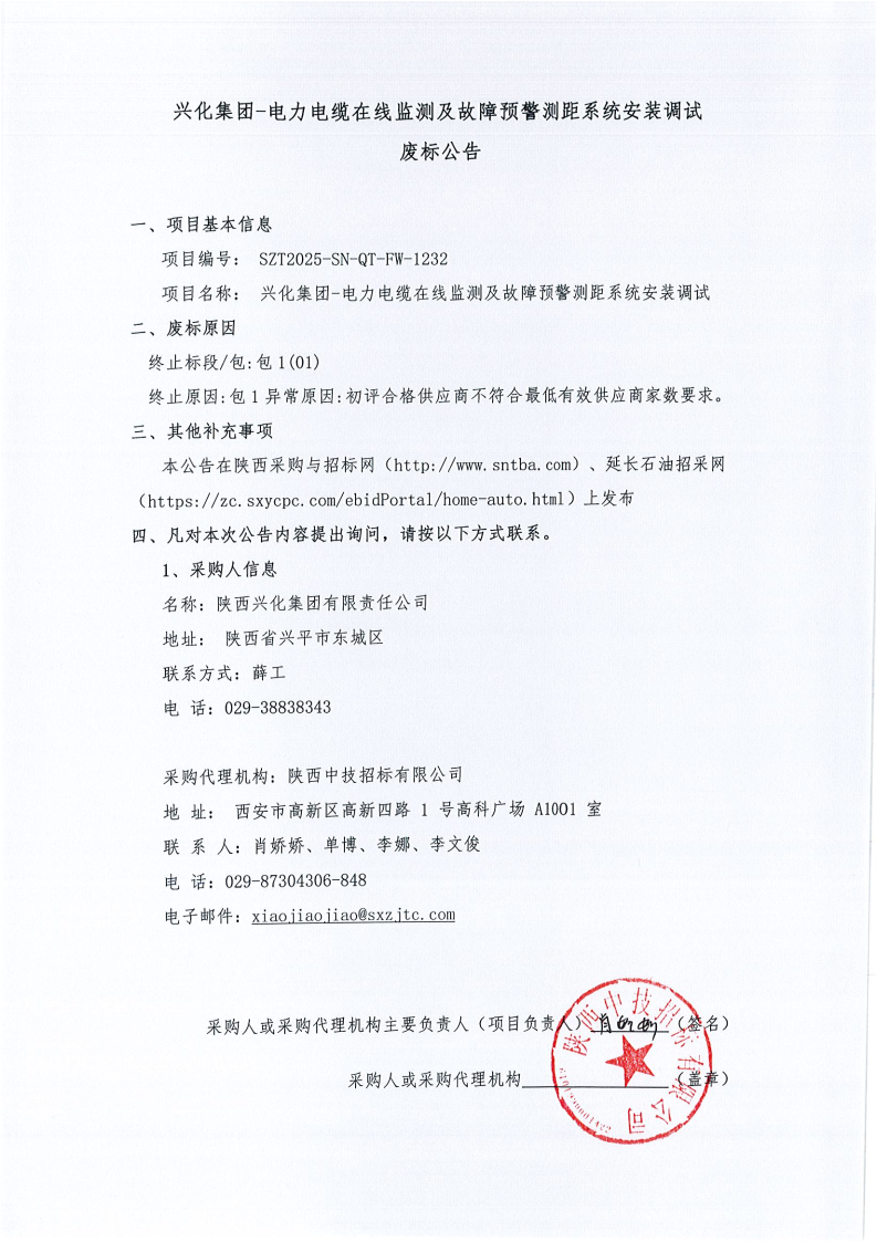 兴化集团-电力电缆在线监测及故障预警测距系统安装调试废标公告