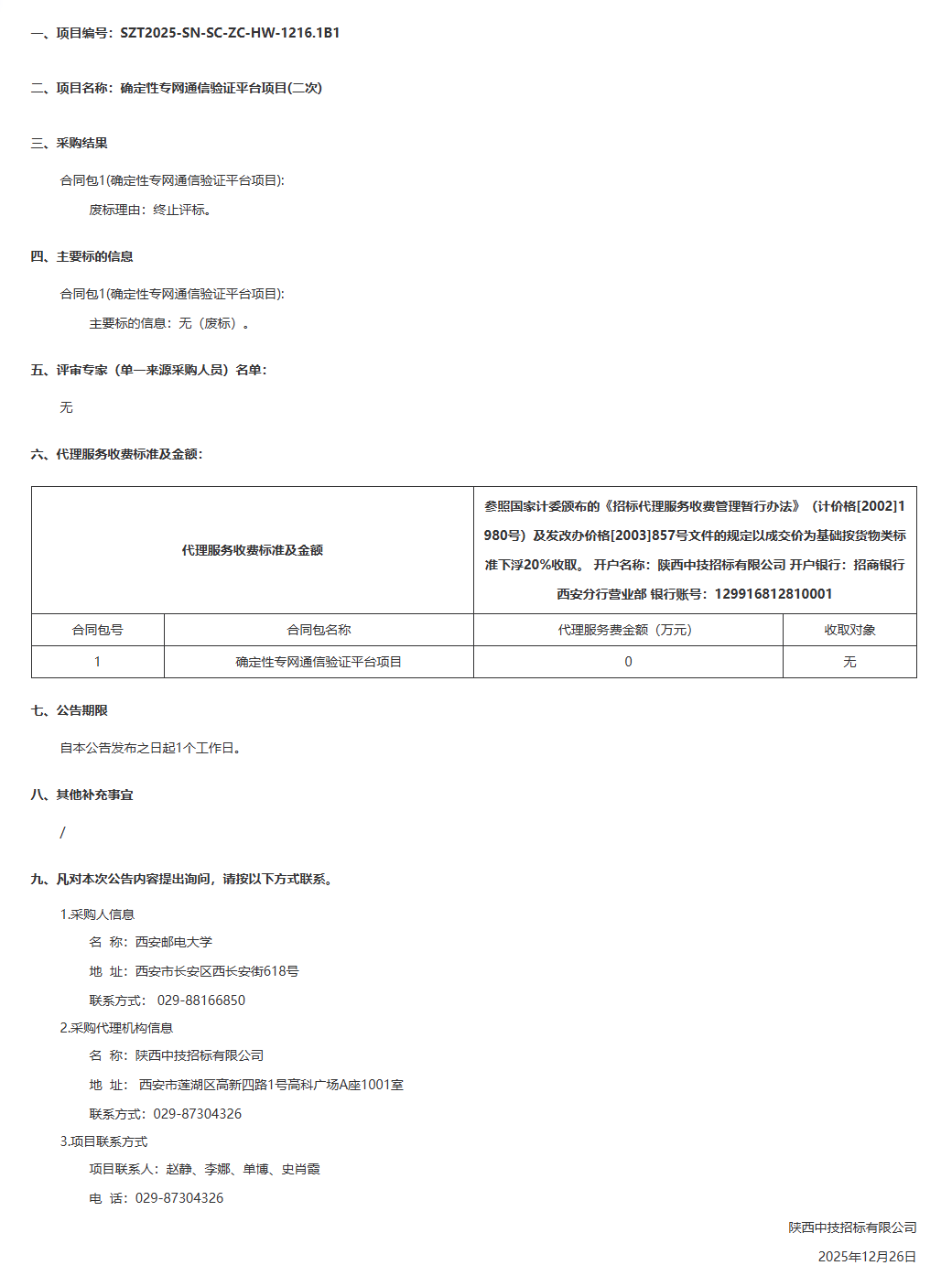 西安邮电大学确定性专网通信验证平台项目(二次)结果公告