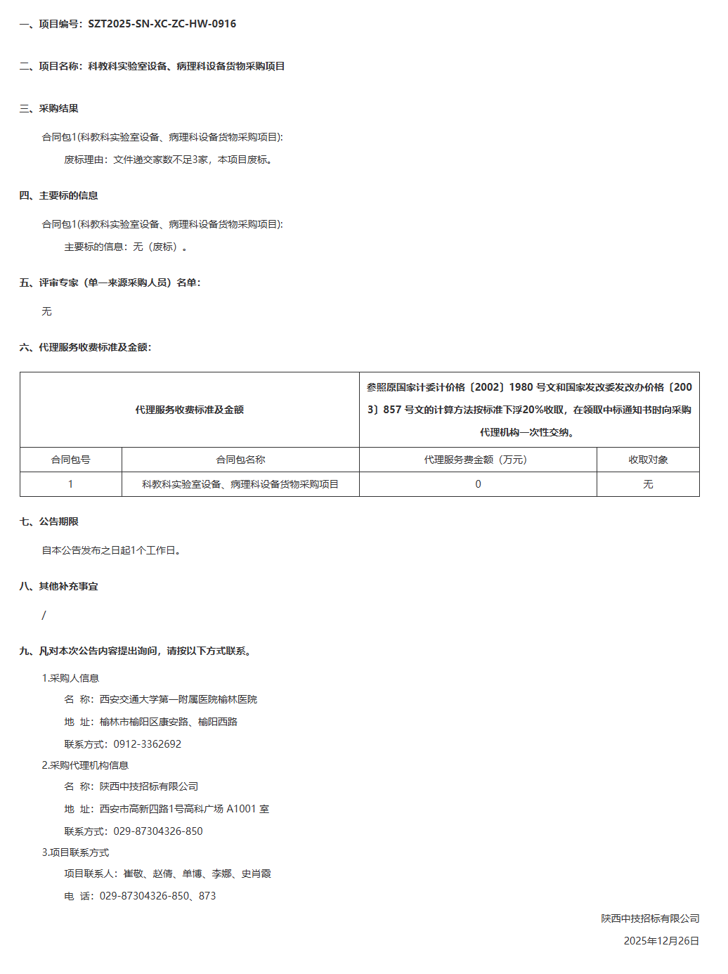 西安交通大学第一附属医院榆林医院科教科实验室设备、病理科设备货物采购项目废标公告