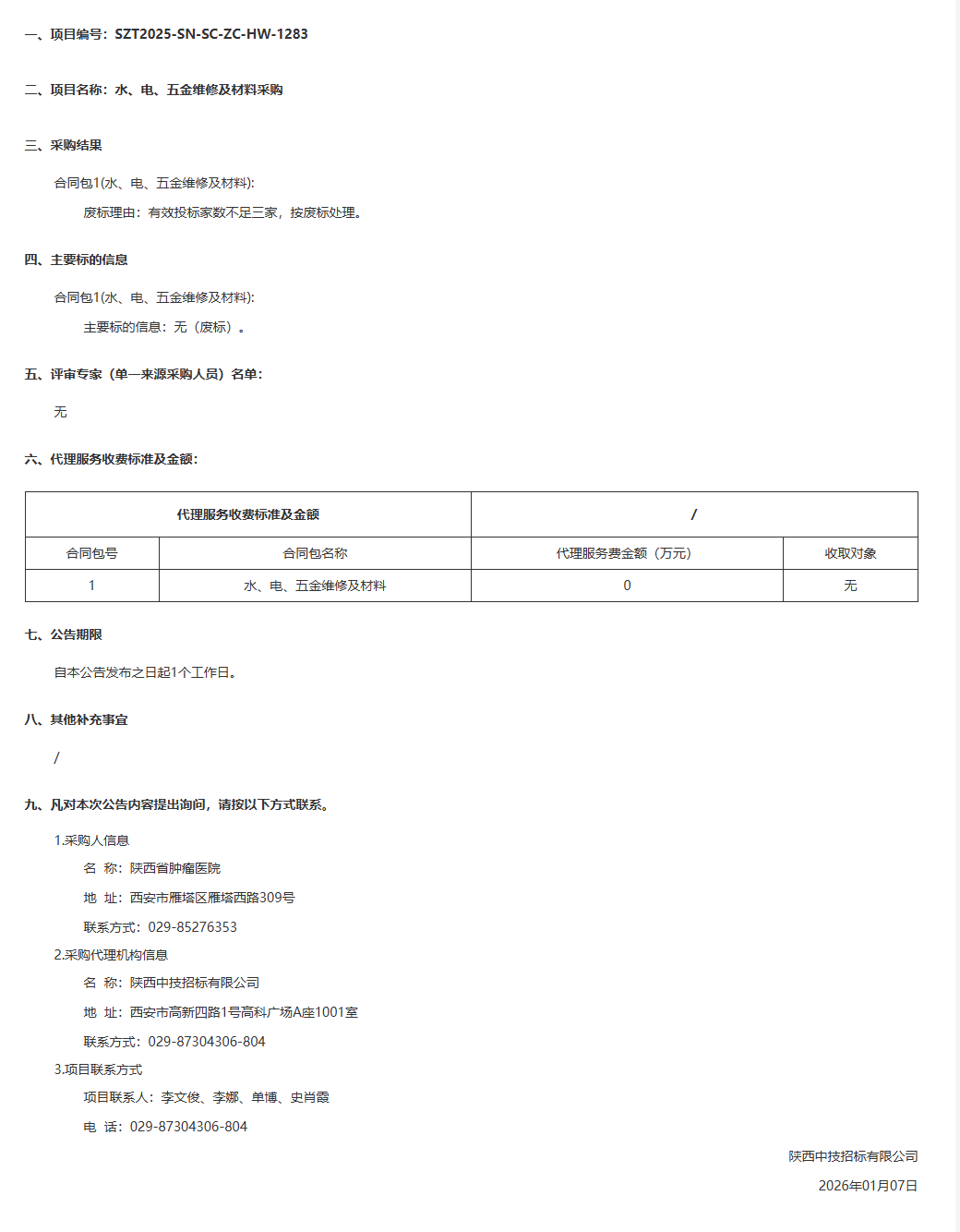 陕西省肿瘤医院水、电、五金维修及材料采购结果公告