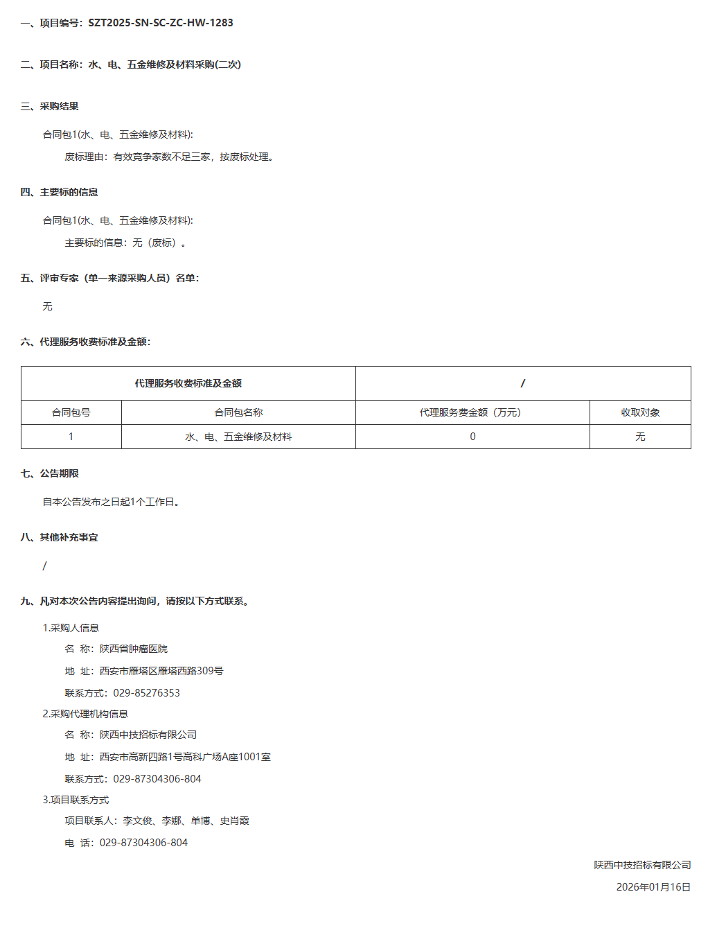 陕西省肿瘤医院水、电、五金维修及材料采购(二次)结果公告