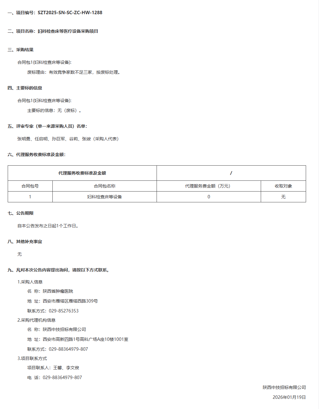陕西省肿瘤医院妇科检查床等医疗设备采购项目结果公告