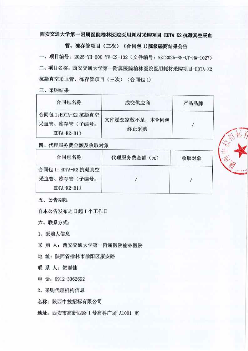 西安交通大学第一附属医院榆林医院医用耗材采购项目-EDTA-K2抗凝真空采血管、冻存管项目(三次)(合同包1)院级磋商结果公告