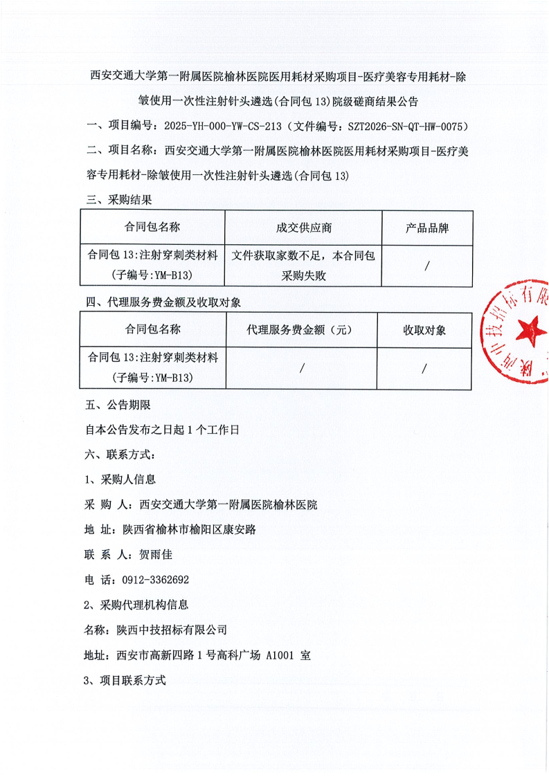 西安交通大学第一附属医院榆林医院医用耗材采购项目-医疗美容专用耗材-除皱使用一次性注射针头遴选(合同包13)院级磋商结果公告
