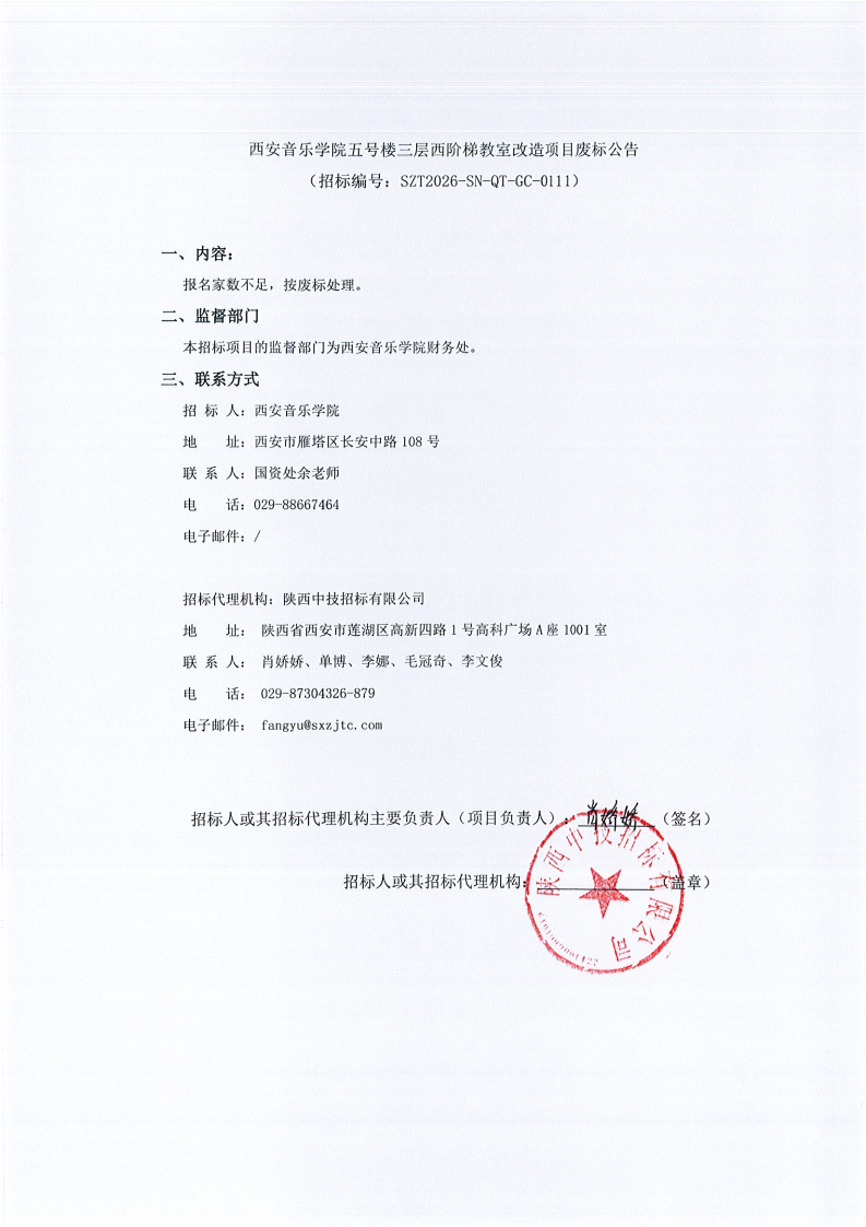 西安音乐学院五号楼三层西阶梯教室改造项目废标公告