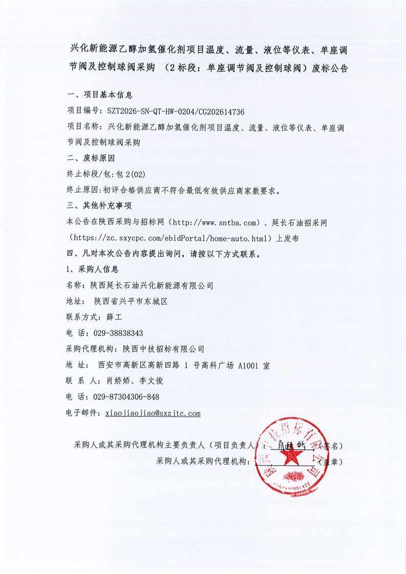 兴化新能源乙醇加氢催化剂项目温度、流量、液位等仪表、单座调节阀及控制球阀采购(2标段:单座调节阀及控制球阀)废标公告