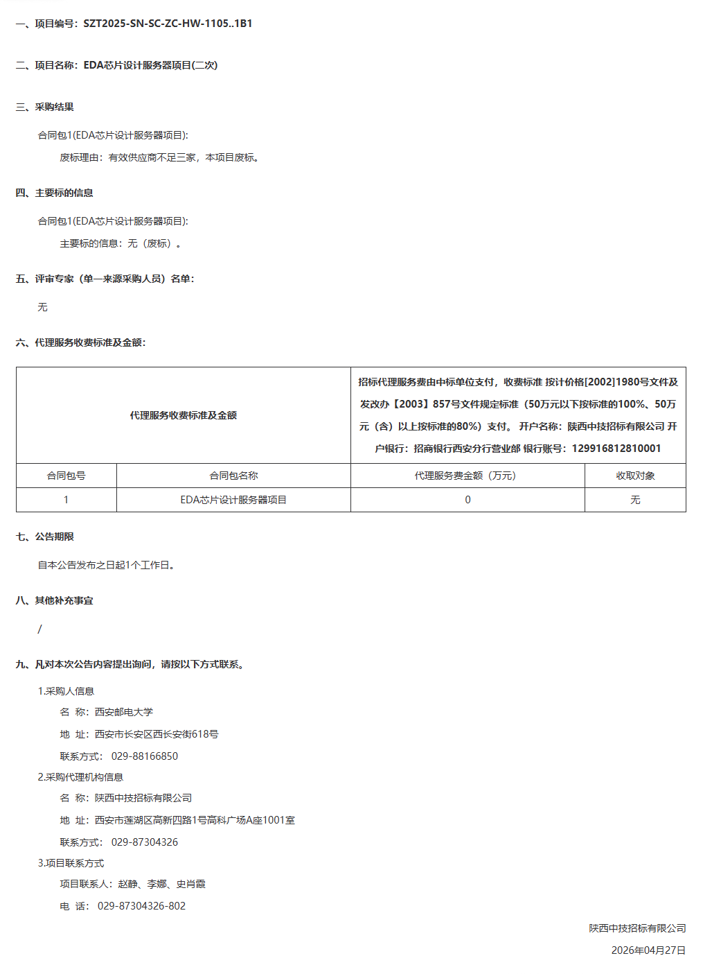 西安邮电大学EDA芯片设计服务器项目(二次)结果公告