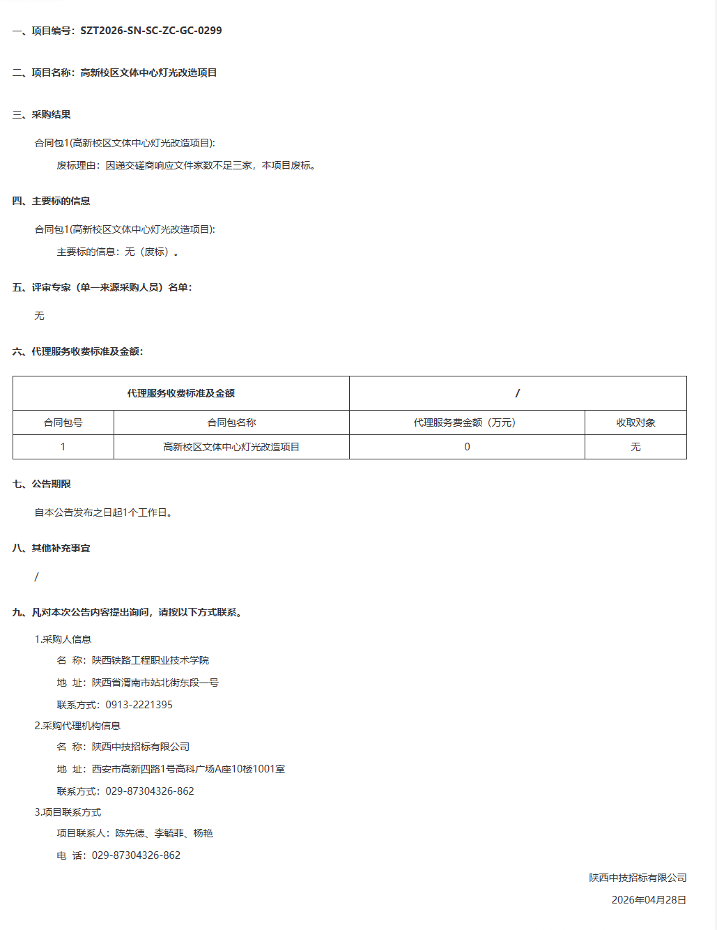 陕西铁路工程职业技术学院高新校区文体中心灯光改造项目结果公告