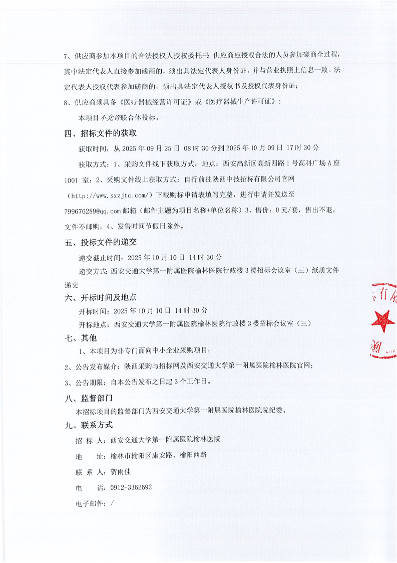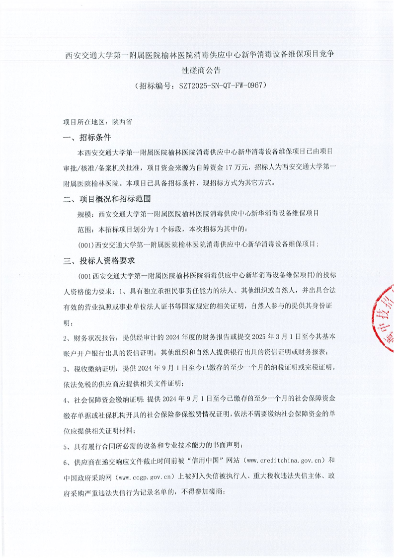 西安交通大学第一附属医院榆林医院消毒供应中心新华消毒设备维保项目竞争性磋商公告