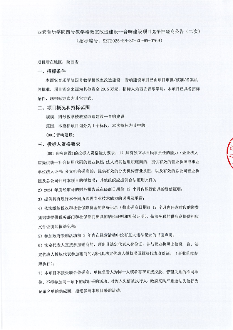西安音乐学院四号教学楼教室改造建设--音响建设项目竞争性磋商公告(二次)