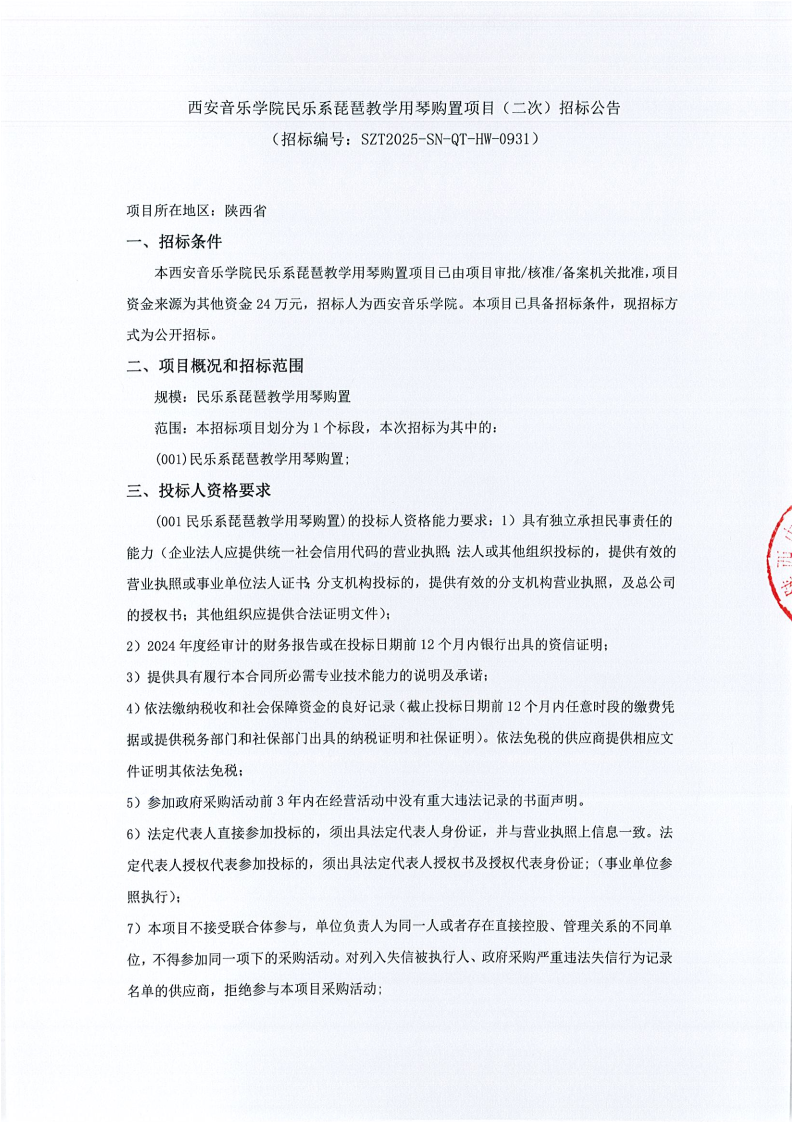 西安音乐学院民乐系琵琶教学用琴购置项目(二次)招标公告