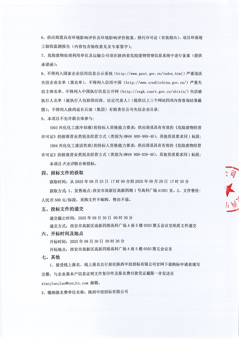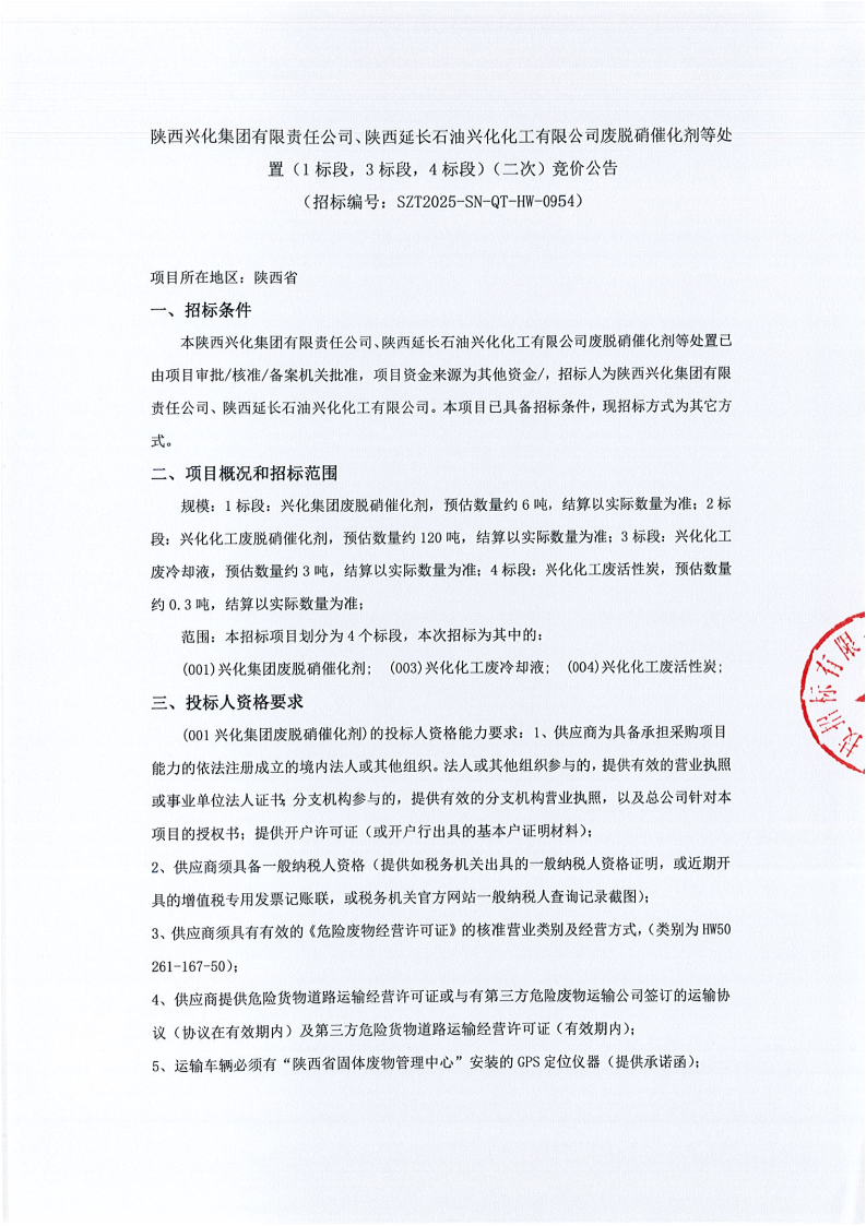 陕西兴化集团有限责任公司、陕西延长石油兴化化工有限公司废脱硝催化剂等处置(1标段,3标段,4标段)(二次)竞价公告