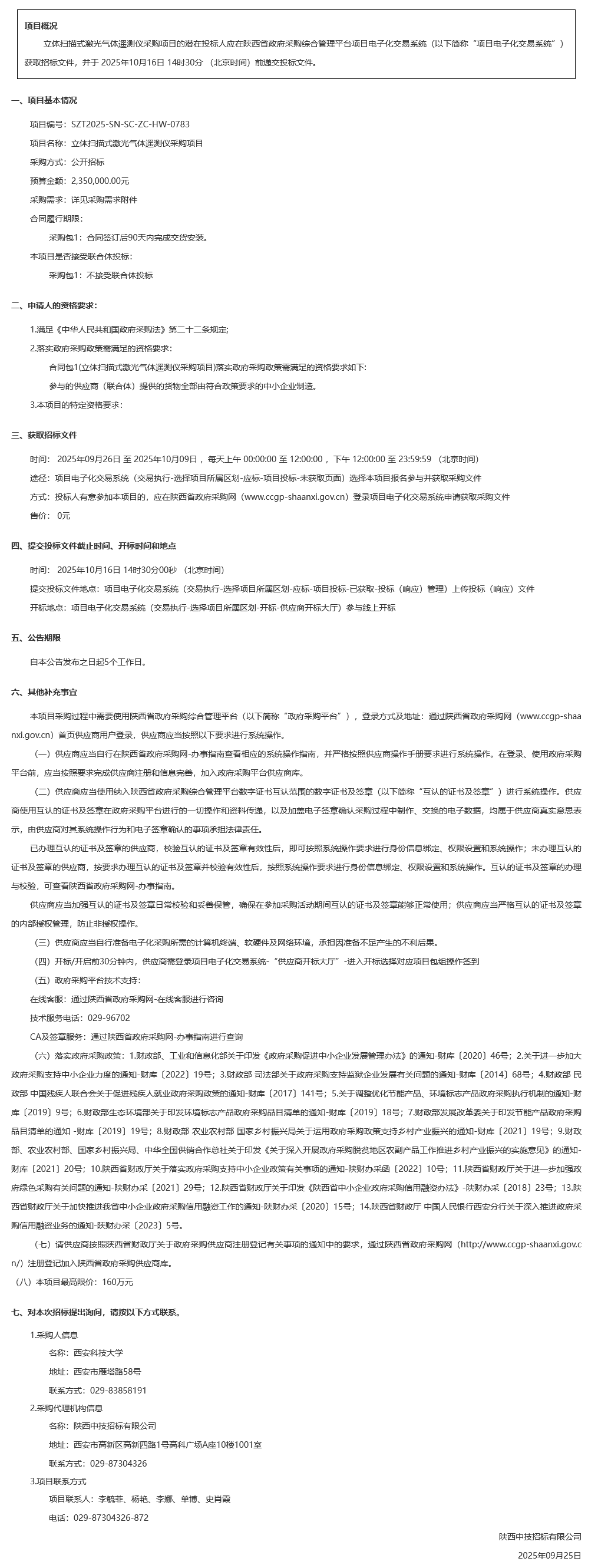 西安科技大学立体扫描式激光气体遥测仪采购项目招标公告