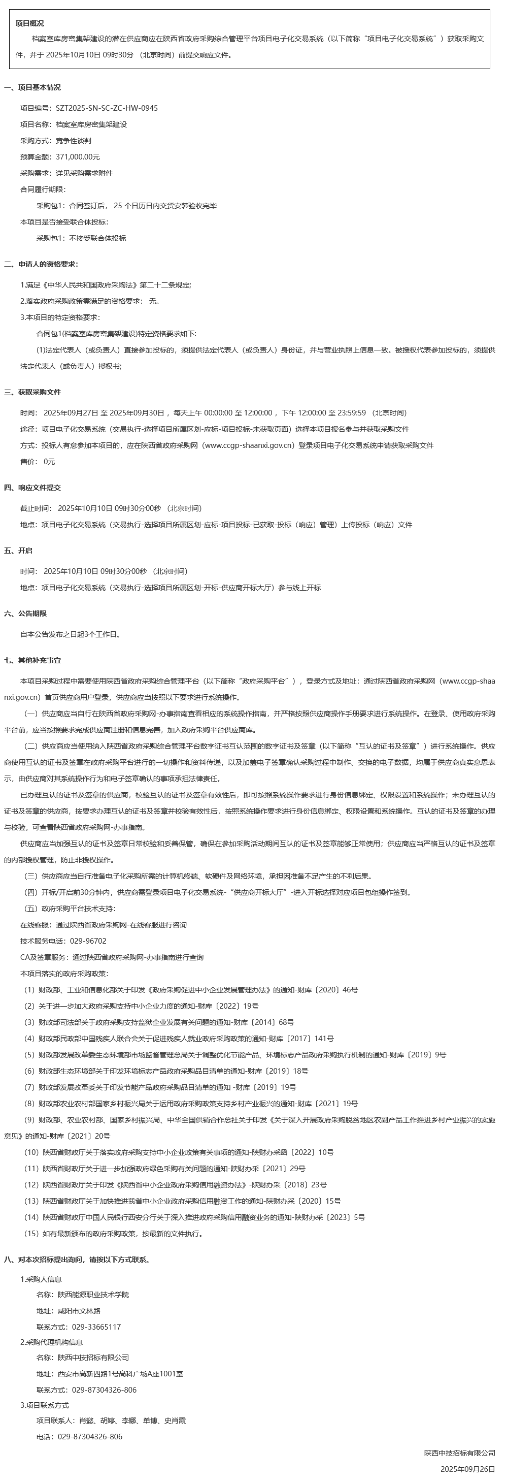 陕西能源职业技术学院档案室库房密集架建设竞争性谈判公告