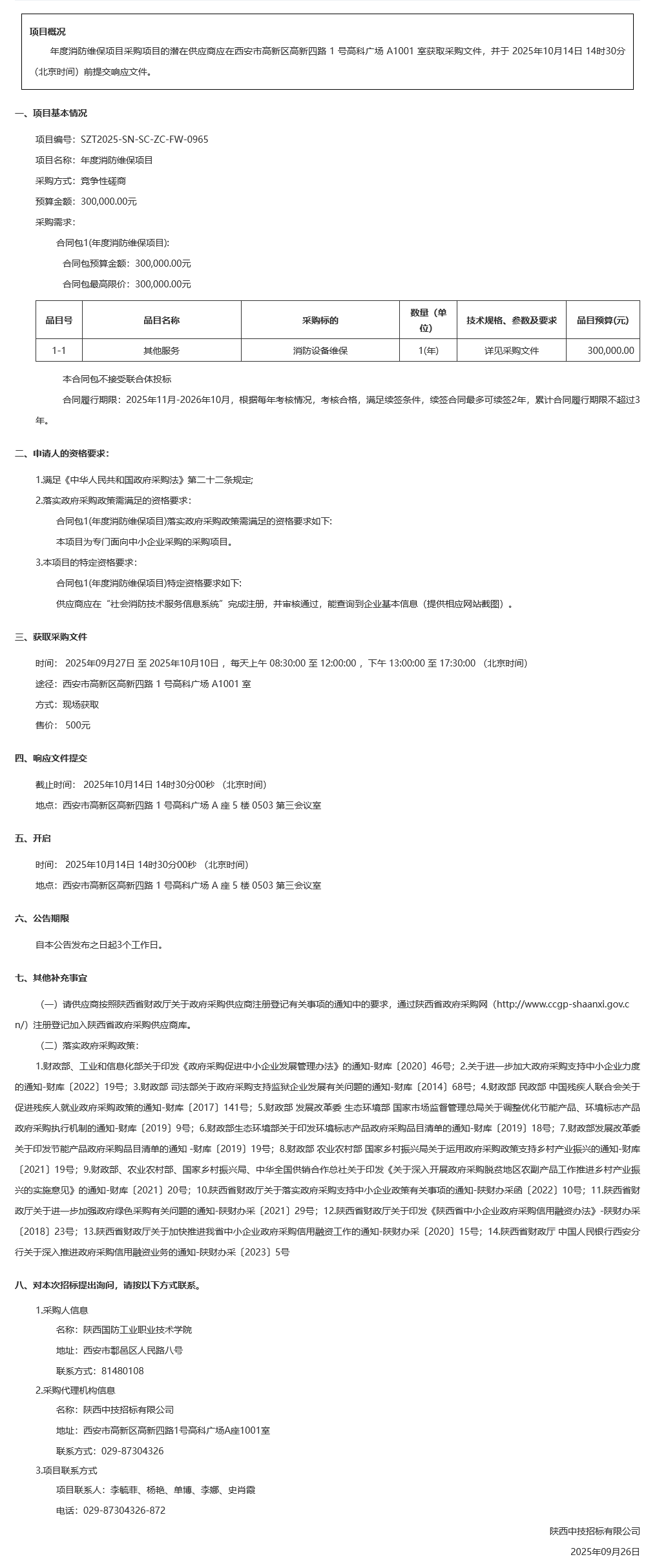 陕西国防工业职业技术学院年度消防维保项目竞争性磋商公告