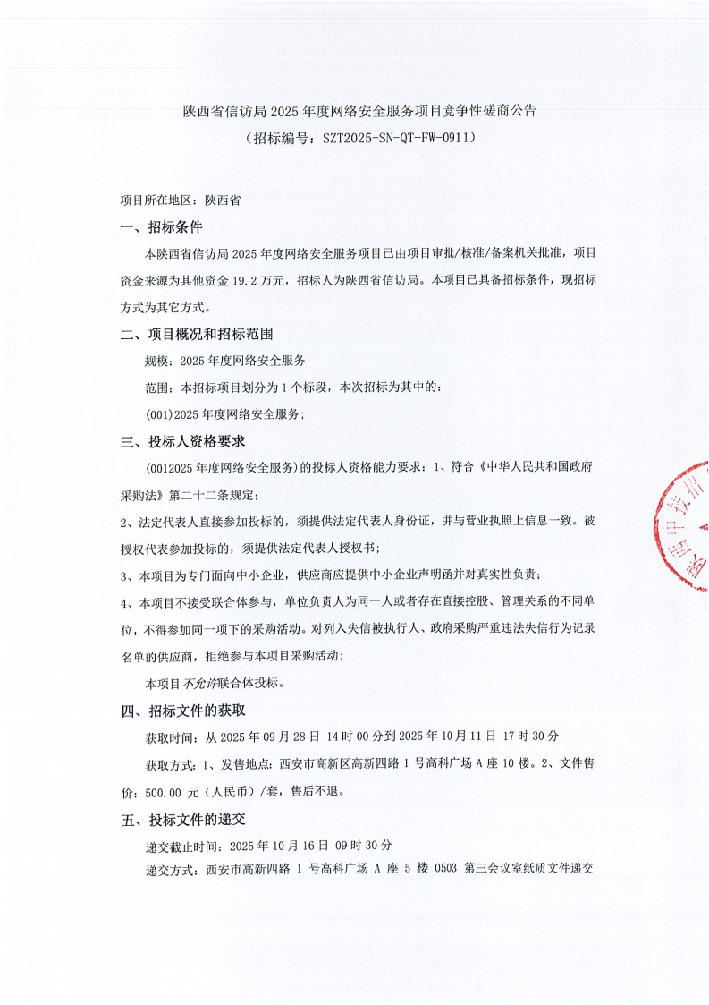 陕西省信访局2025年度网络安全服务项目竞争性磋商公告