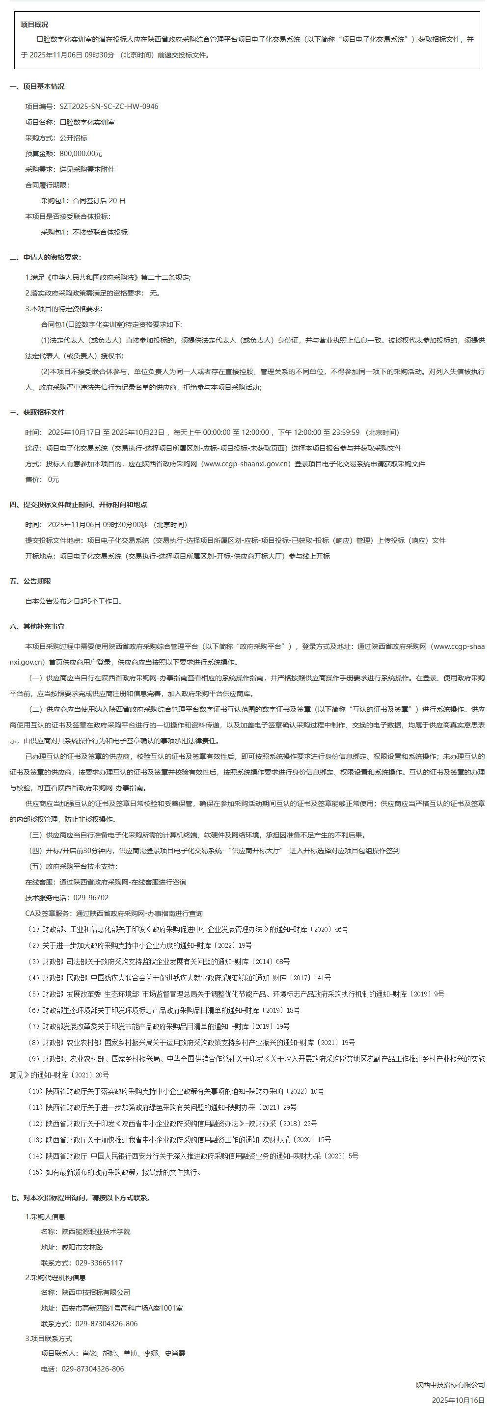 陕西能源职业技术学院口腔数字化实训室招标公告