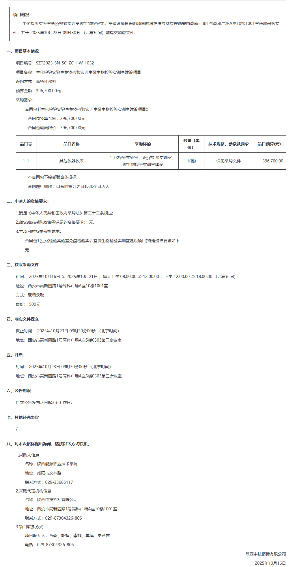 陕西能源职业技术学院生化检验实验室免疫检验实训室微生物检验实训室建设项目竞争性谈判公告