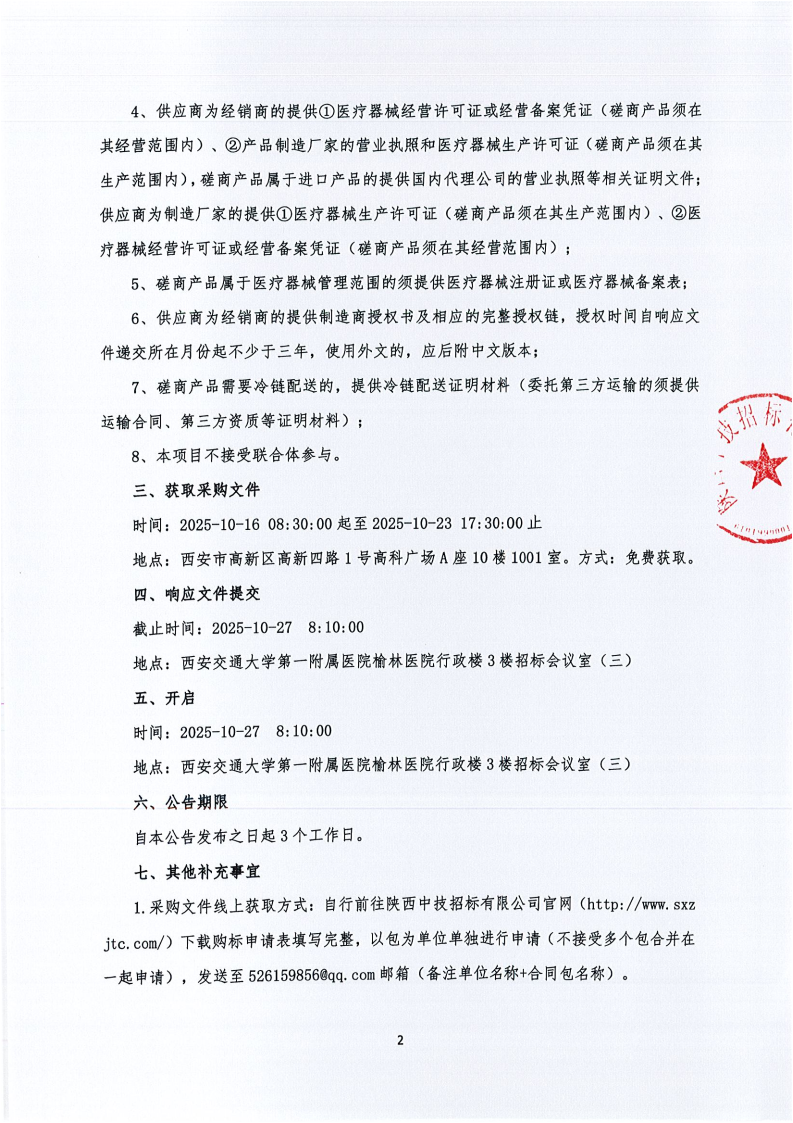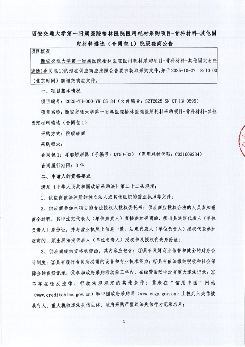 西安交通大学第一附属医院榆林医院医用耗材采购项目-骨科材料-其他固定材料遴选(合同包1)院级磋商公告