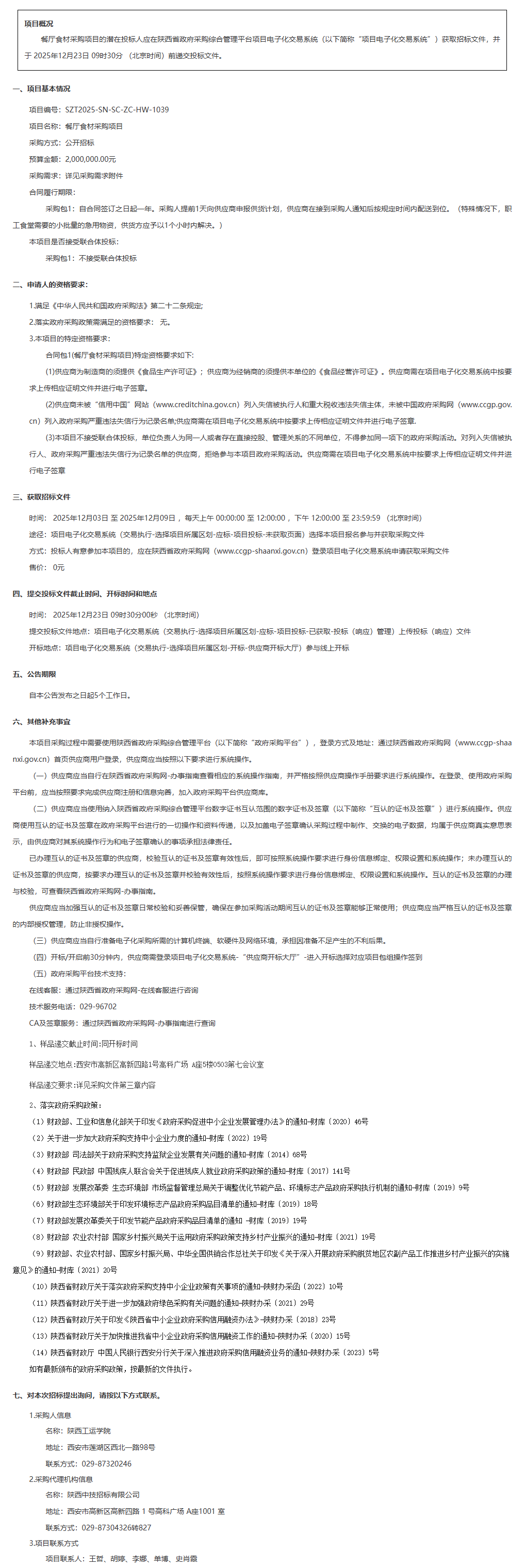 陕西工运学院餐厅食材采购项目招标公告