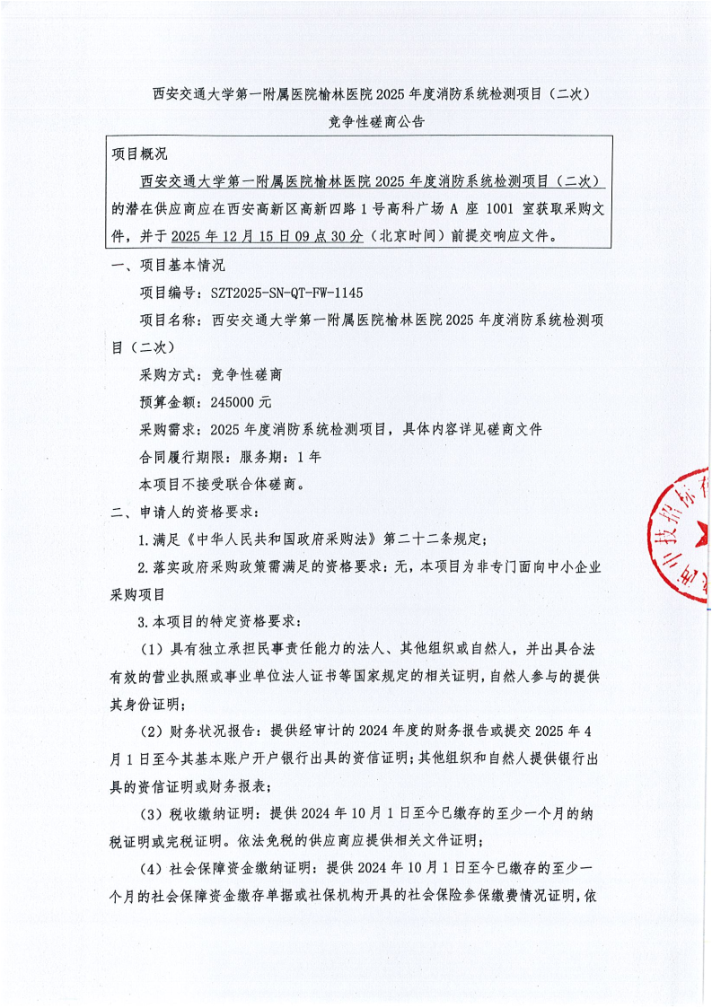 西安交通大学第一附属医院榆林医院2025年度消防系统检测项目(二次)