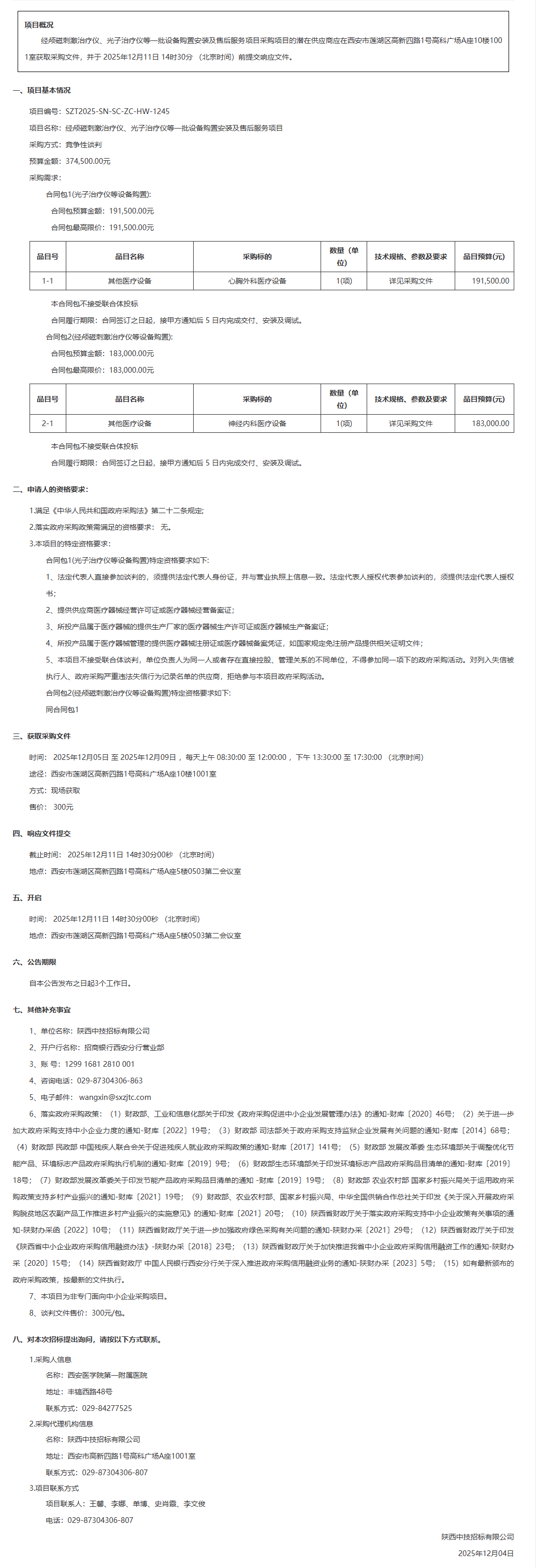 西安医学院第一附属医院经颅磁刺激治疗仪、光子治疗仪等一批设备购置安装及售后服务项目竞争性谈判公告