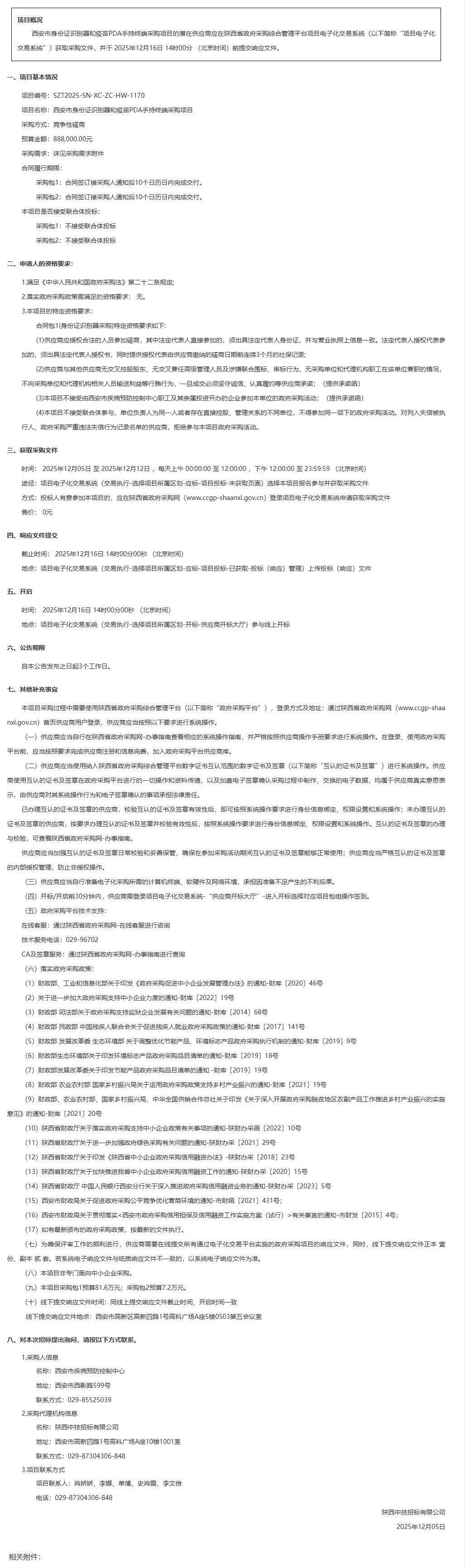 西安市疾病预防控制中心西安市身份证识别器和疫苗PDA手持终端采购项目竞争性磋商公告