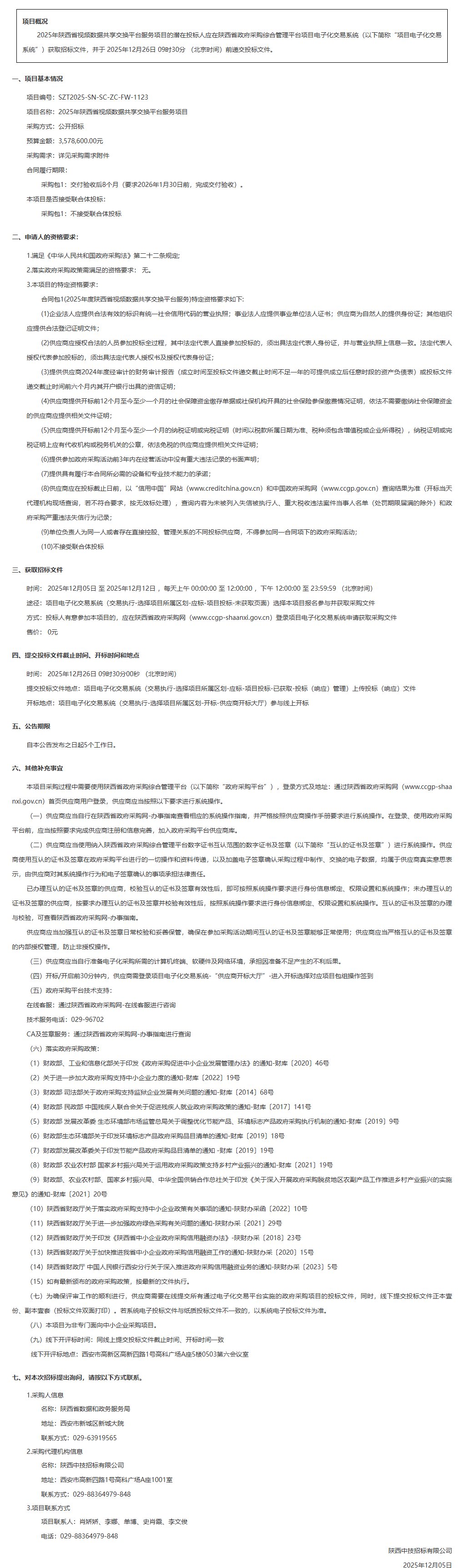 陕西省数据和政务服务局2025年陕西省视频数据共享交换平台服务项目招标公告