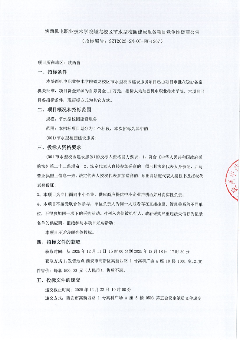 陕西机电职业技术学院蟠龙校区节水型校园建设服务项目竞争性磋商公告