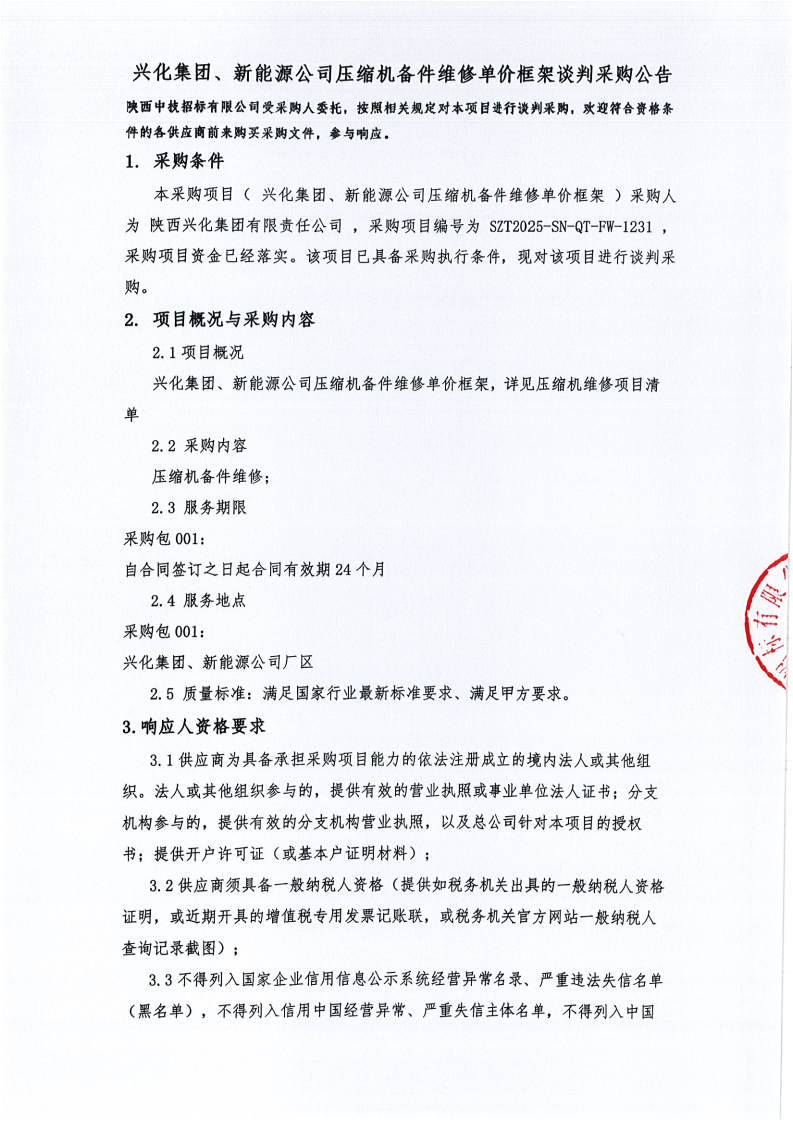 兴化集团、新能源公司压缩机备件维修单价框架采购谈判公告
