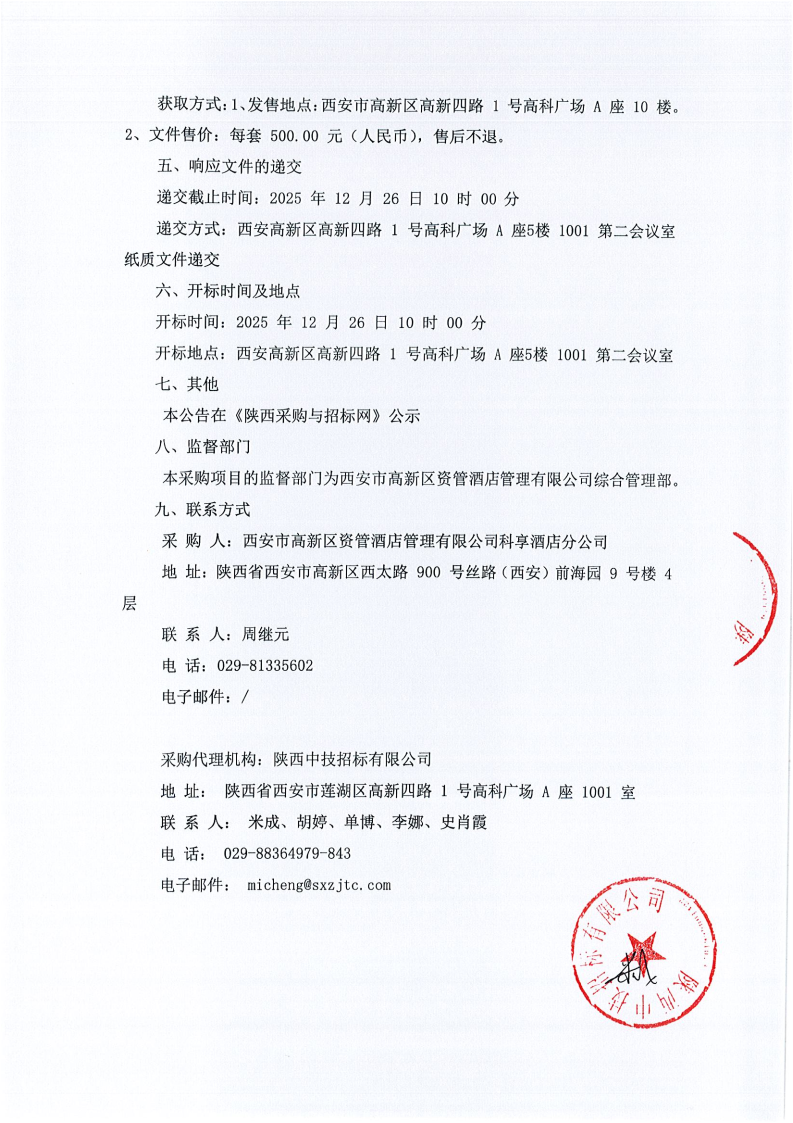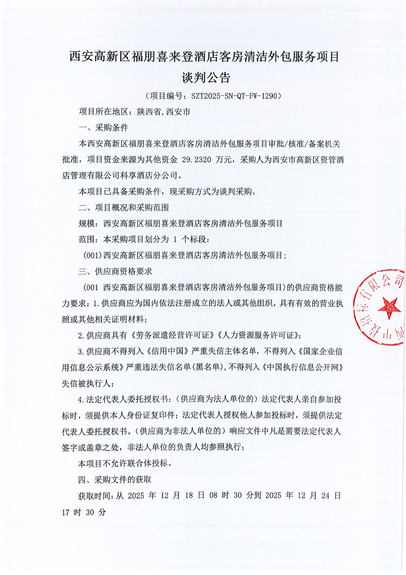 西安高新区福朋喜来登酒店客房清洁外包服务项目谈判公告