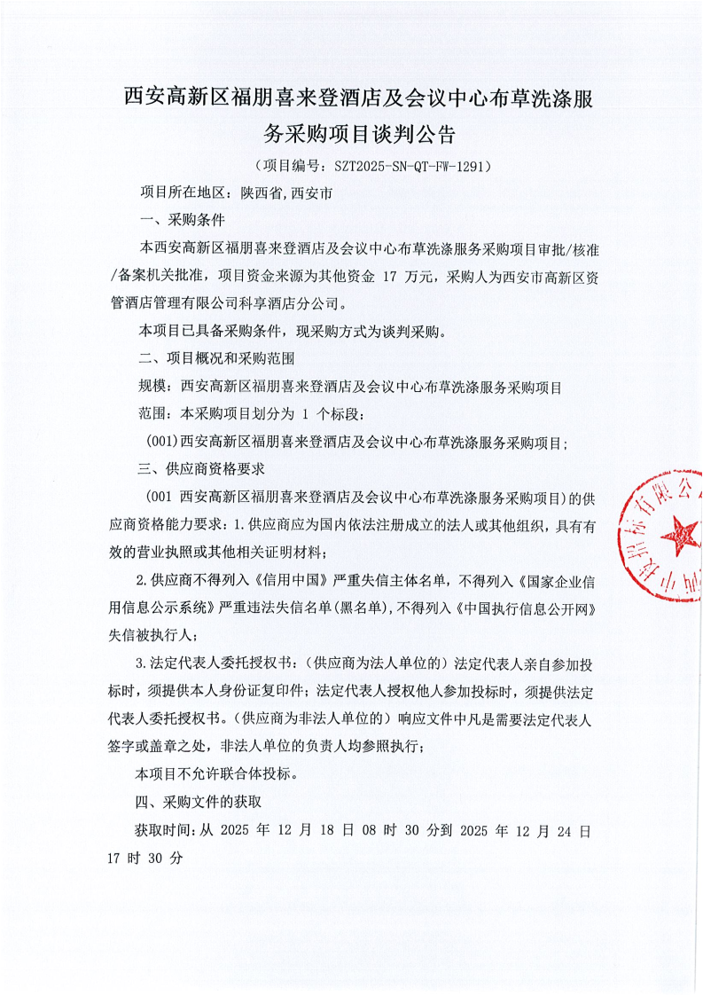 西安高新区福朋喜来登酒店及会议中心布草洗涤服务采购项目谈判公告