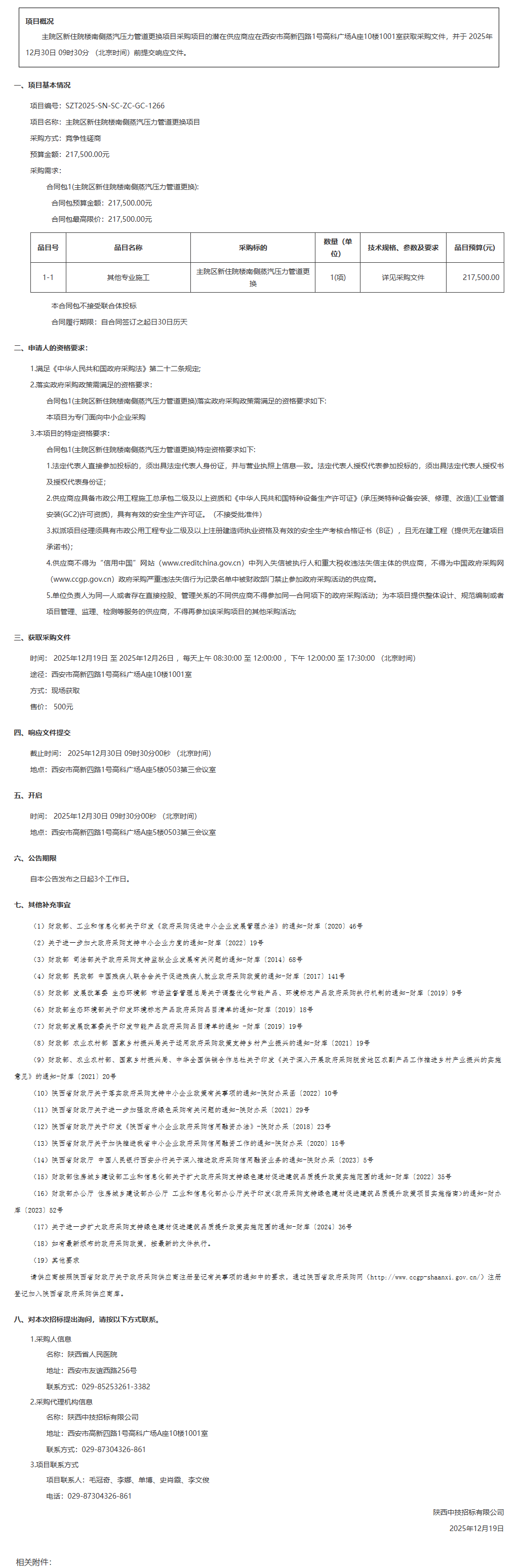 陕西省人民医院主院区新住院楼南侧蒸汽压力管道更换项目竞争性磋商公告