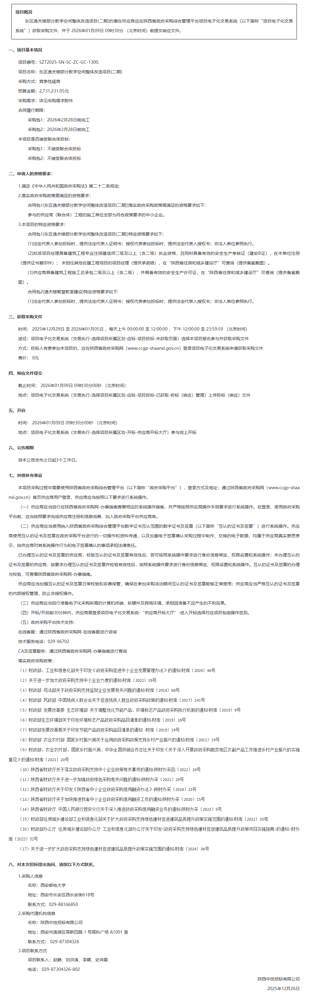 西安邮电大学东区逸夫楼部分教学空间整体改造项目(二期)竞争性磋商公告