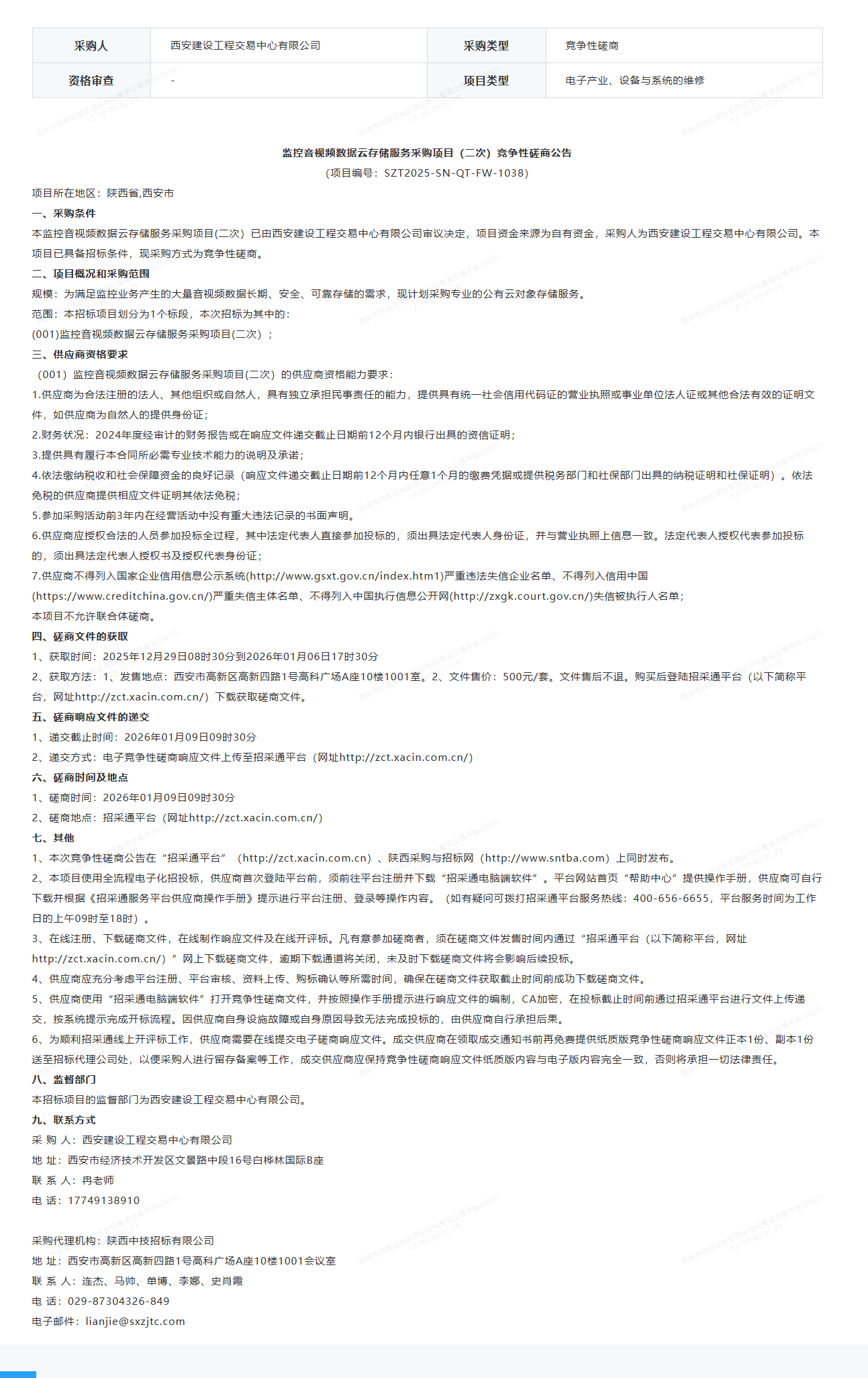 监控音视频数据云存储服务采购项目(二次)竞争性磋商公告