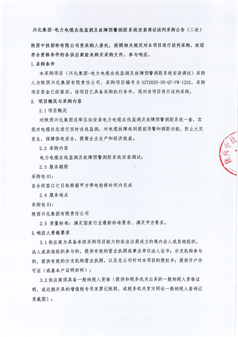 兴化集团-电力电缆在线监测及故障预警测距系统安装调试谈判采购公告(二次)