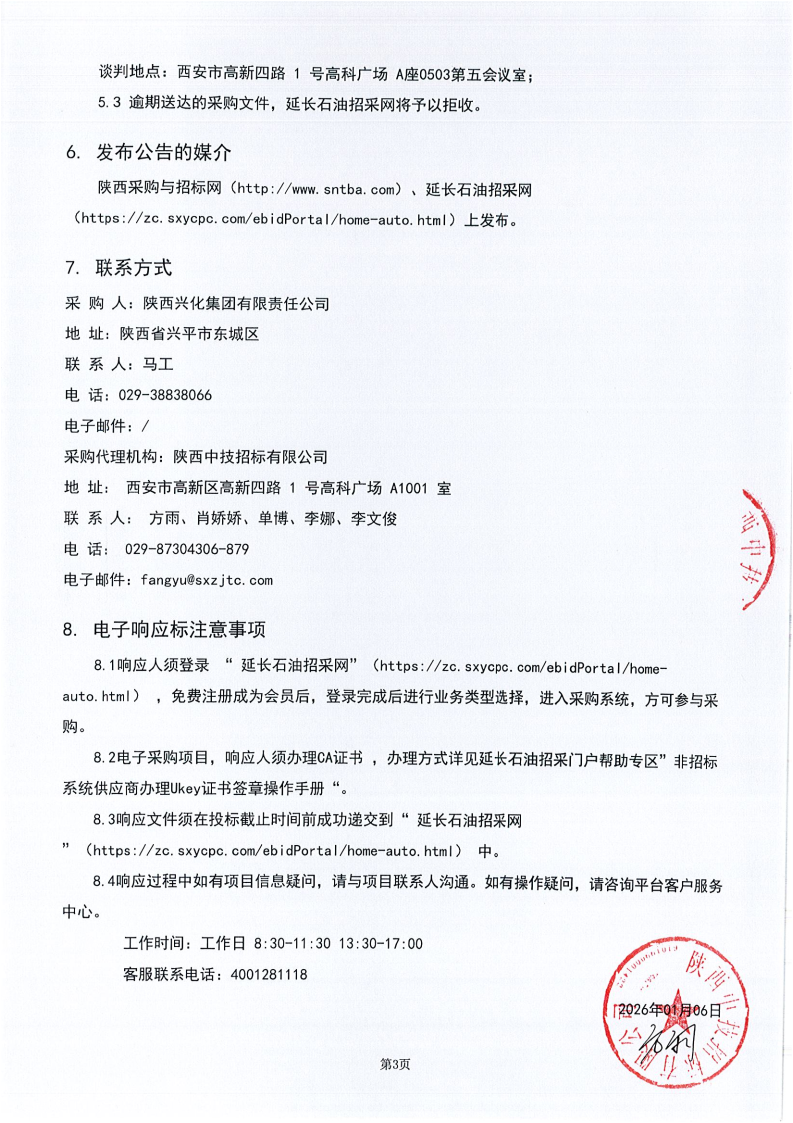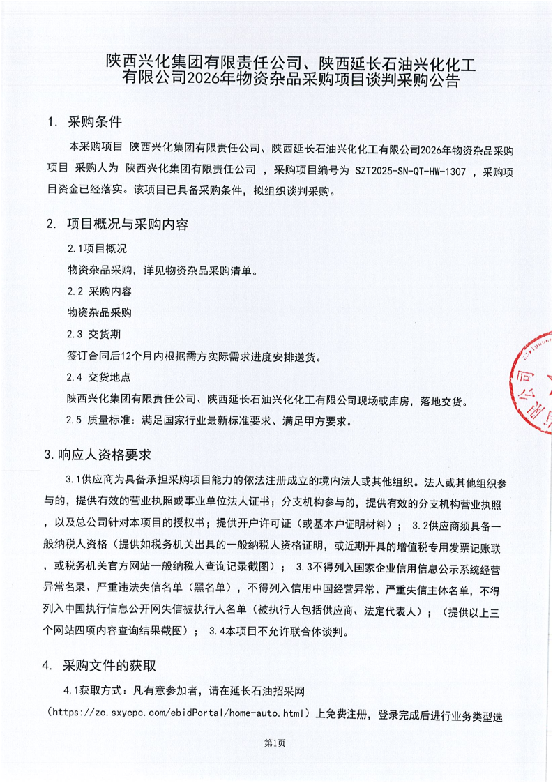 陕西兴化集团有限责任公司、陕西延长石油兴化化工有限公司2026年物资杂品采购项目谈判采购公告